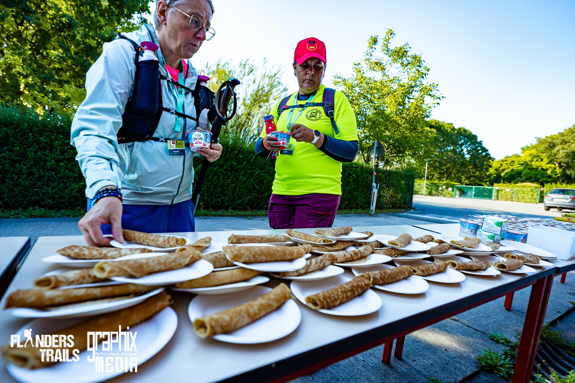 In het deelnamepakket is een ruime bevoorrading inbegrepen. We zorgen voor een diversiteit aan producten, zoals fruit, koeken, energiereep, water, suikerhoudende dranken, honingwafel en voor elke finisher een drankje aan de finish. Als organisator is het onmogelijk te voldoen aan alle persoonlijke eisen van de deelnemers - we voorzien geen glutenvrije en/of lactosevrije producten.